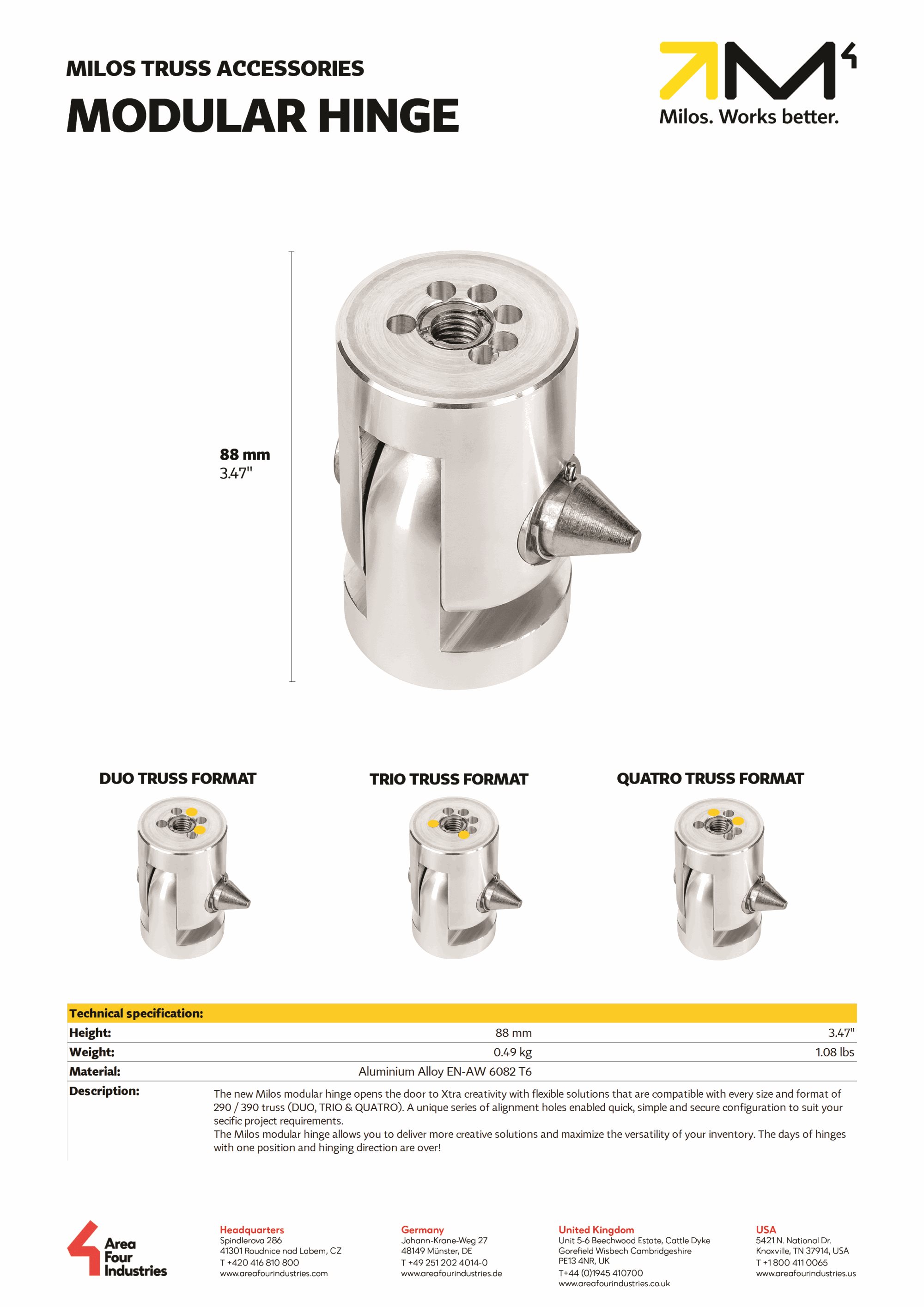 MODULARHINGE-B New MILOS Modular Hinge is compatible with all 290/390 truss formats and connector types.