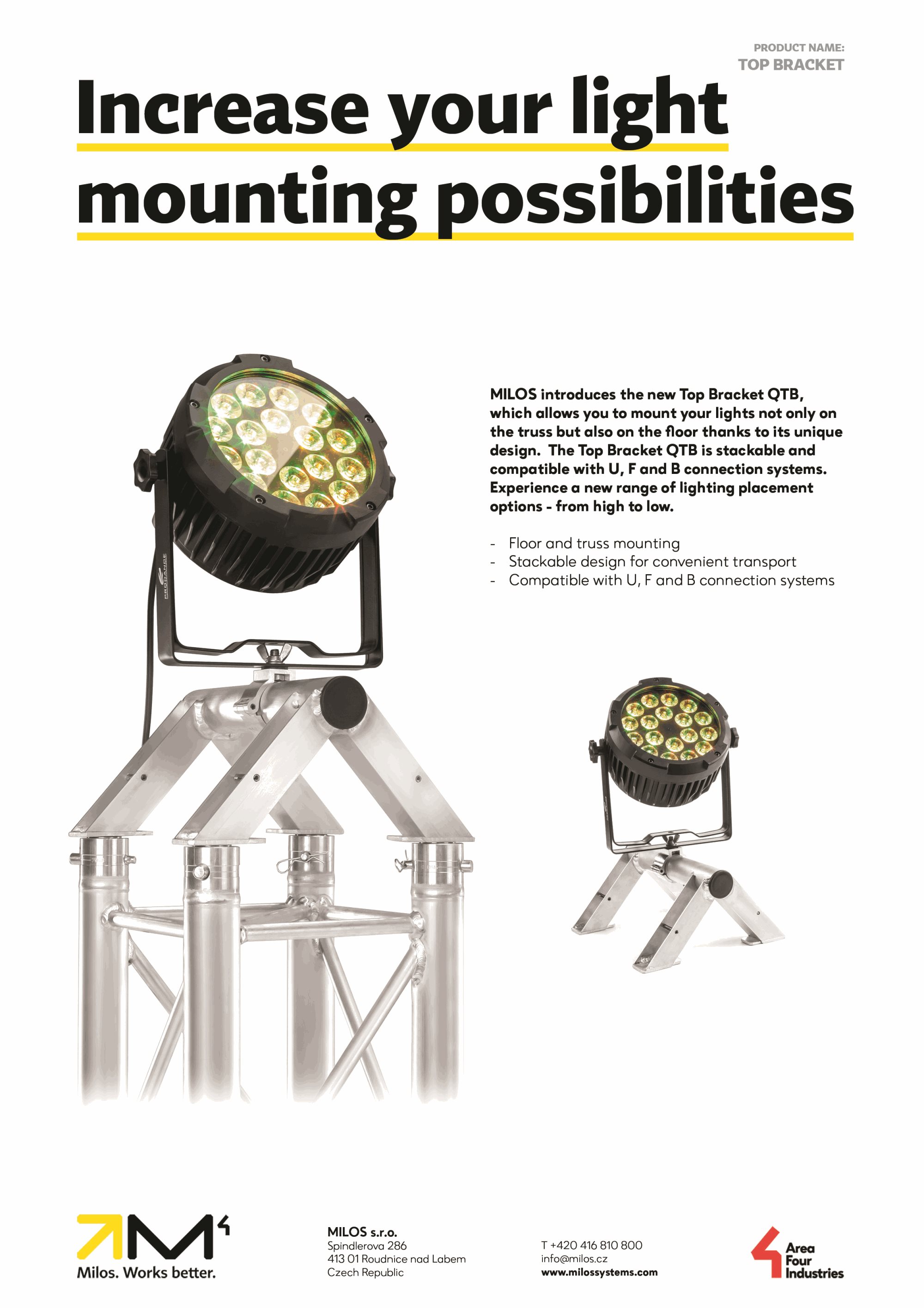 MILOS introduces the new Top Bracket QTB, which allows you to mount your lights not only on the truss but also on the floor thanks to its unique design. The Top Bracket QTB is stackable and compatible with U, F and B connection systems. Experience a new range of lighting placement options - from high to low.