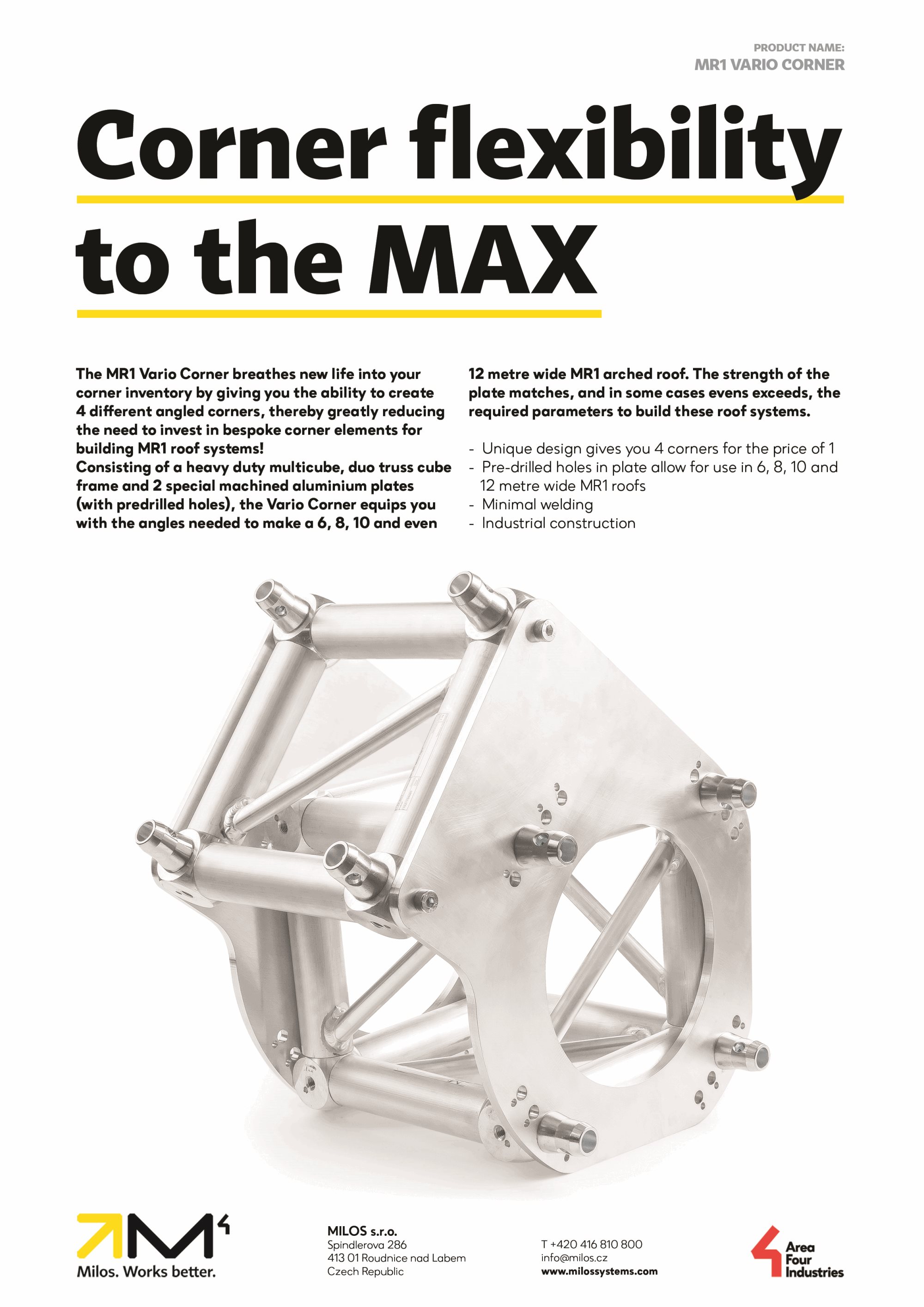 Consisting of a heavy duty multicube, duo truss cube frame and 2 special machined aluminum plates (with predrilled holes), the Vario Corner equips you with the angles needed to make a 6, 8, 10 and 12 meter wide MR1 arched roof. The strength of the plate matches, and in some cases evens exceeds, the required parameters to build these roof systems.