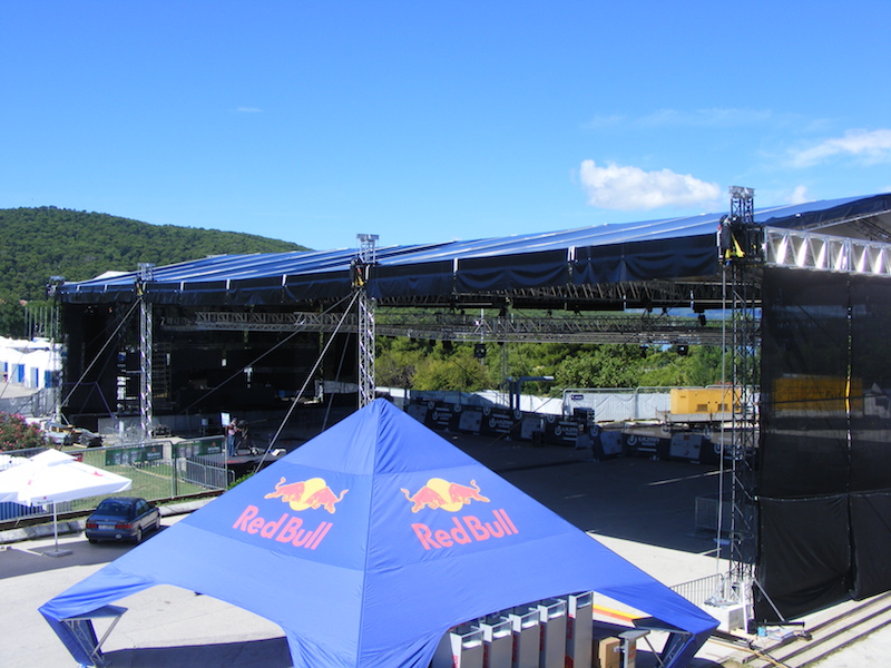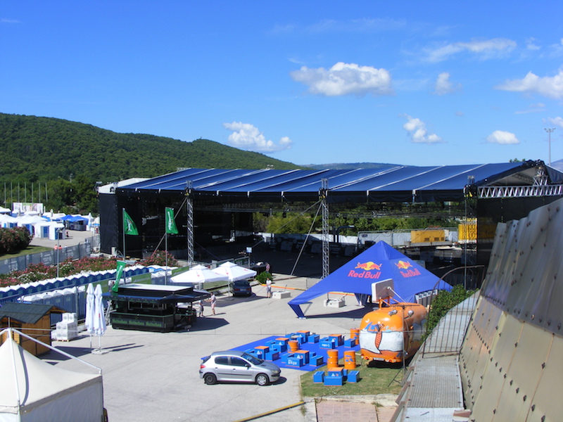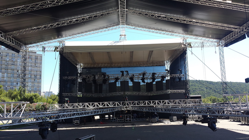 For a party of this magnitude, Ultra Europe Project Manager Zoran Biskupic enlisted the help of Milos distributor KSS in Slovenia to provide “the largest roof structure available” that could cover the area from the fences of the property to the outer walls of the stadium. The truss structures also needed to be the safest and most stable, so they would hold up to the wild and crazy atmosphere expected to engulf the music event grounds. KSS answered the call by supplying two Milos roof structures joined together for a combined length of 60 metres and a height of 12m. Also supplied was subtrussing for the roofs and most of the subtrussing for the main floor.